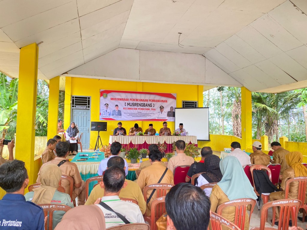 Pematang Tiga- Kecamatan Pematang Tiga pada hari Senin (03/02/25) menggelar acara rutin tahunan yaitu Musyawarah Perencanaan Pembangunan (Musrenbang) Kecamatan. Musyawarah Perencanaan Pembangunan (Musrenbang) Kecamatan adalah media komunikasi antara pemangku kebijakan dengan masyarakat tentang perencanaan pembangunan untuk mendapatkan masukan mengenai kegiatan prioritas pembangunan di wilayah kecamatan terkait yang didasarkan pada masukan dari hasil Musrenbang Desa, serta menyepakati rencana kegiatan lintas desa di kecamatan yang bersangkutan. Dalam Kesempatan kali ini Bapak Camat Pematang Tiga Madeslianto MS, S.Sos., M.AP membuka acara sekaligus membuka acara Musrenbang. Hadir pula Kepala Bappeda Kabupaten Bengkulu Tengah Hartoni Satria, SE. M.Si, Perwakilan Anggota DPRD, Perwakilan Kapolsek dan Koramil Pondok Kelapa, Dinas Kesehatan, Dinas Pertanian, Direktur PDAM, Kepala Desa se-Kecamatan Pematang Tiga, Perwakilan BPD, Korwil, KUA Pematang Tiga serta elemen masyarakat lainnya.